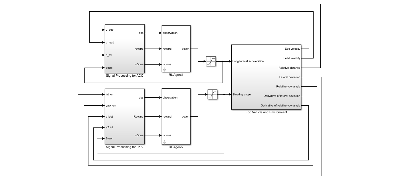 This example shows how to train multiple agents to collaboratively perform path-following control (PFC) for a vehicle. The goal of PFC is to make the ego vehicle travel at a set velocity while maintaining a safe distance from a lead car by controlling longitudinal acceleration and braking, and also while keeping the vehicle traveling along the center line of its lane by controlling the front steering angle. For more information on PFC, see Path Following Control System (Model Predictive Control Toolbox).