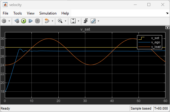 The reference velocity for the ego car is defined as follows. If the relative distance is less than the safe distance, the ego car tracks the minimum of the lead car velocity and driver-set velocity. In this manner, the ego car maintains some distance from the lead car. If the relative distance is greater than the safe distance, the ego car tracks the driver-set velocity. In this example, the safe distance is defined as a linear function of the current ego car longitudinal velocity , that is, . The safe distance determines the tracking velocity for the ego car.