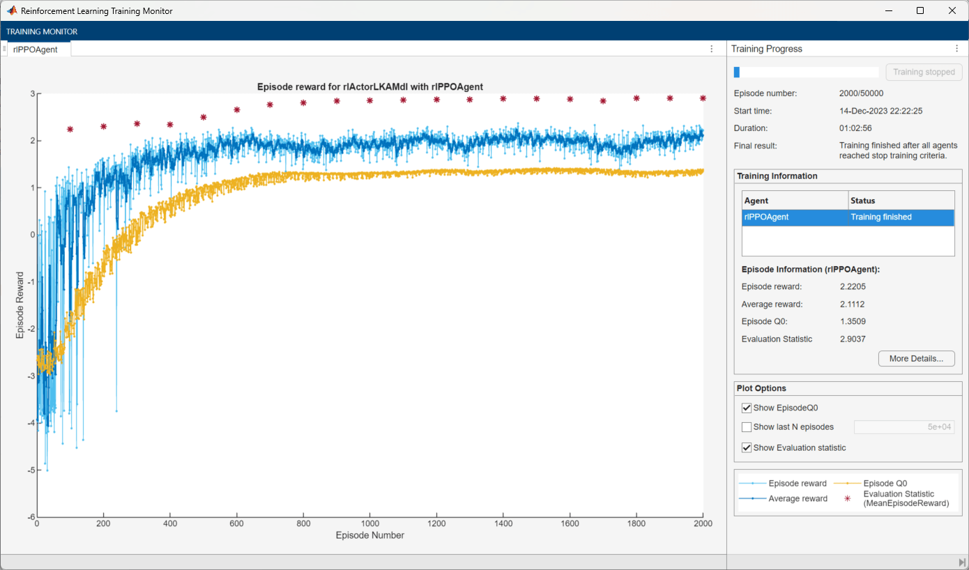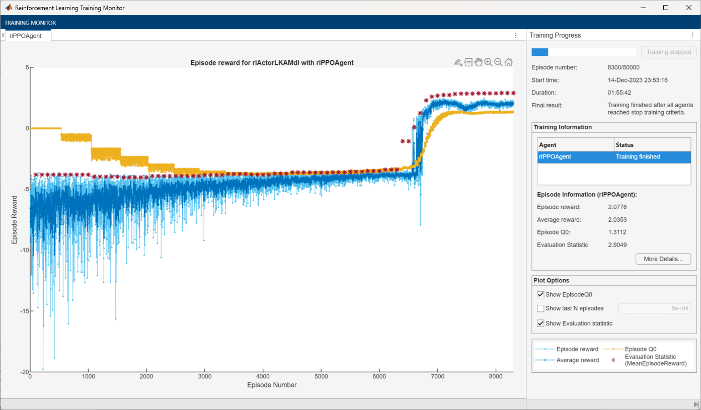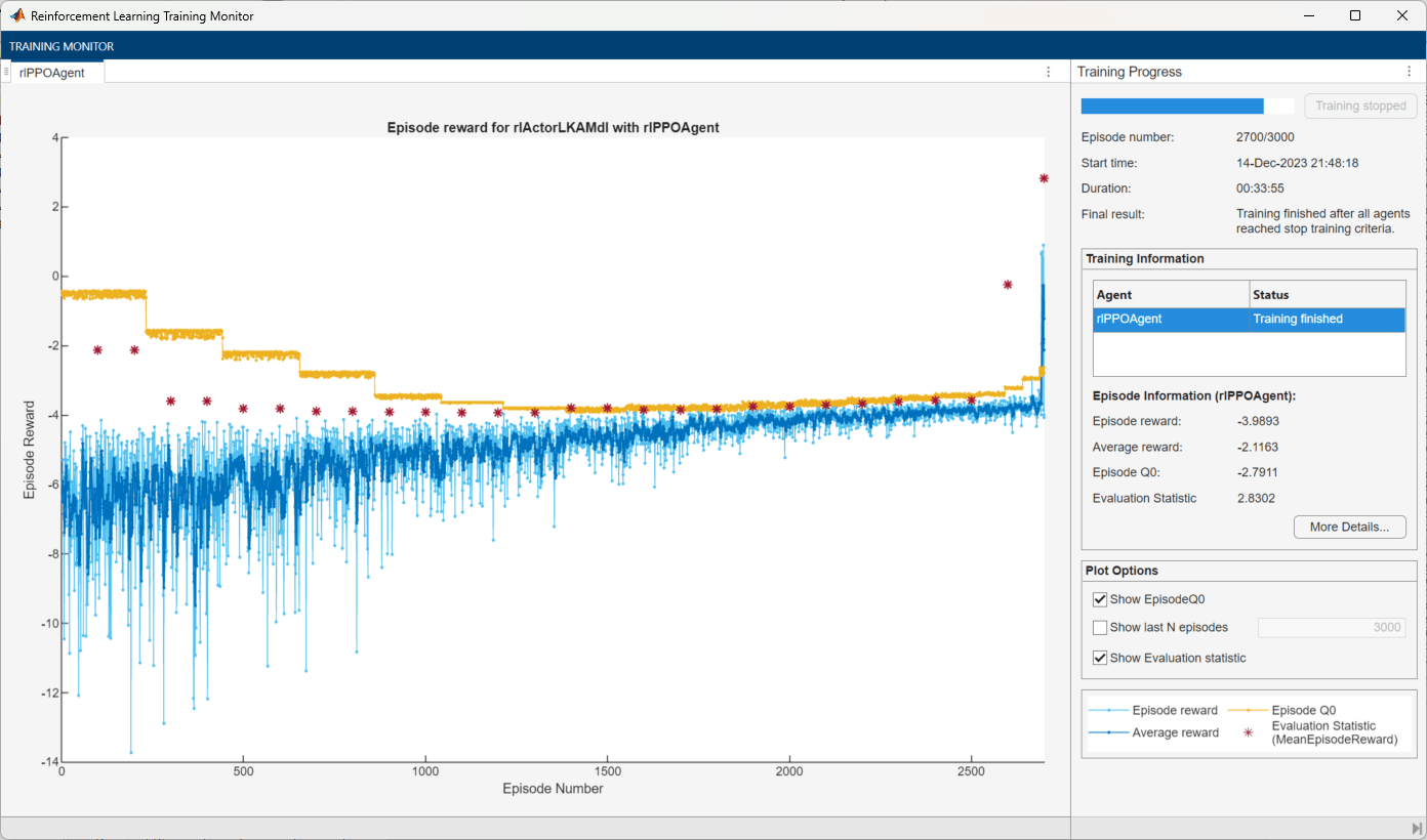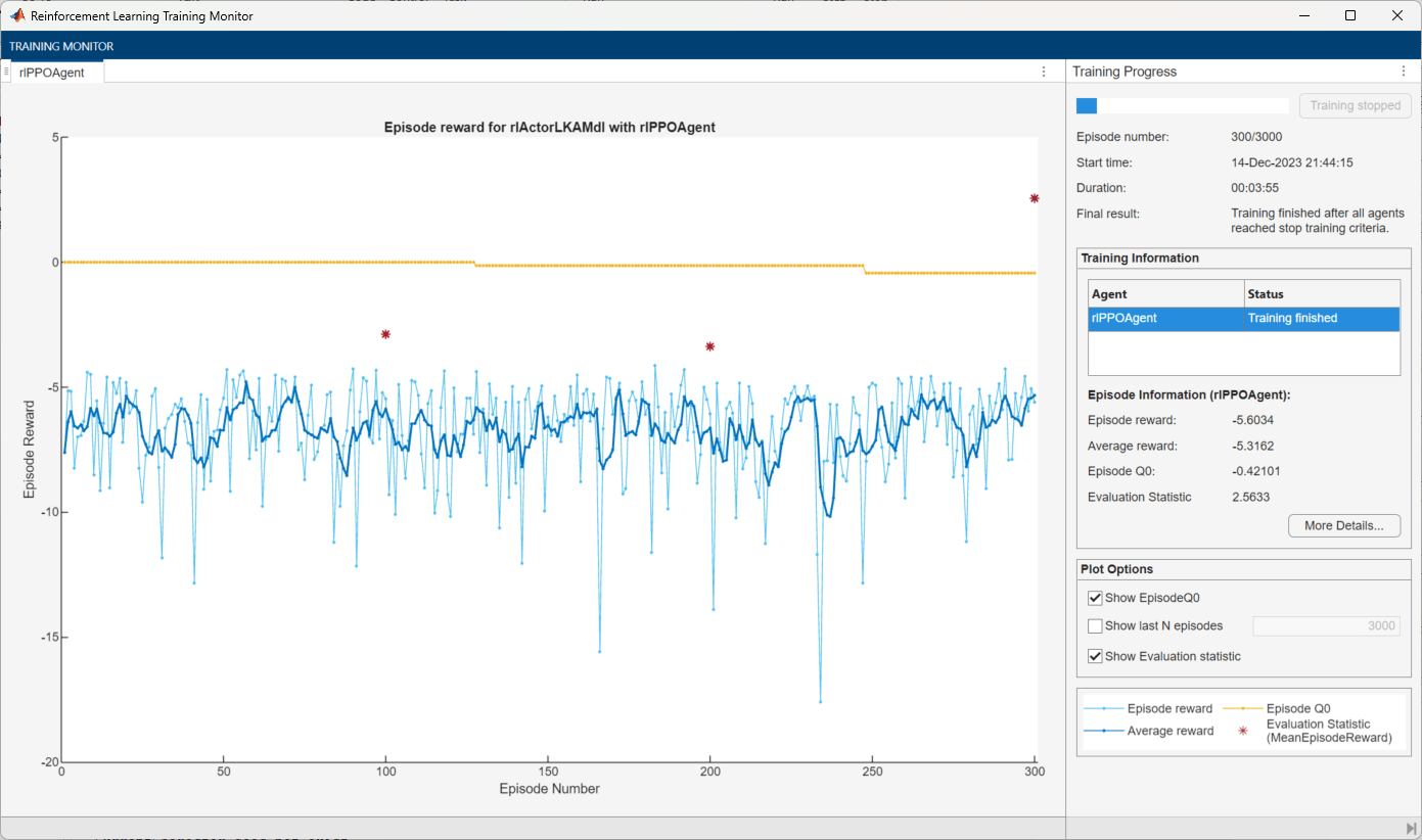 if doTraining trainingStats3 = train(agent,env,trainingOpts,Evaluator=evl); else load("LKAPPOAgent.mat") end