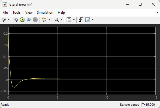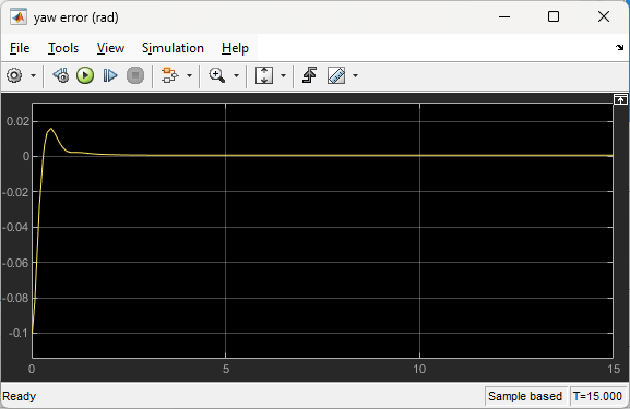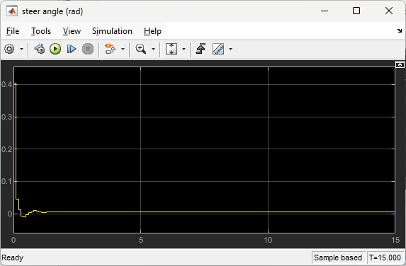 The lateral error and the yaw error both approach zero, as shown in the respective plots. The vehicle starts with a lateral deviation from the centerline (0.2 m) and a nonzero yaw angle error (–0.1 rad). The lane keeping controller makes the ego vehicle travel along the centerline after approximately two seconds. The steering angle shows that the controller reaches a steady state within the same time frame.