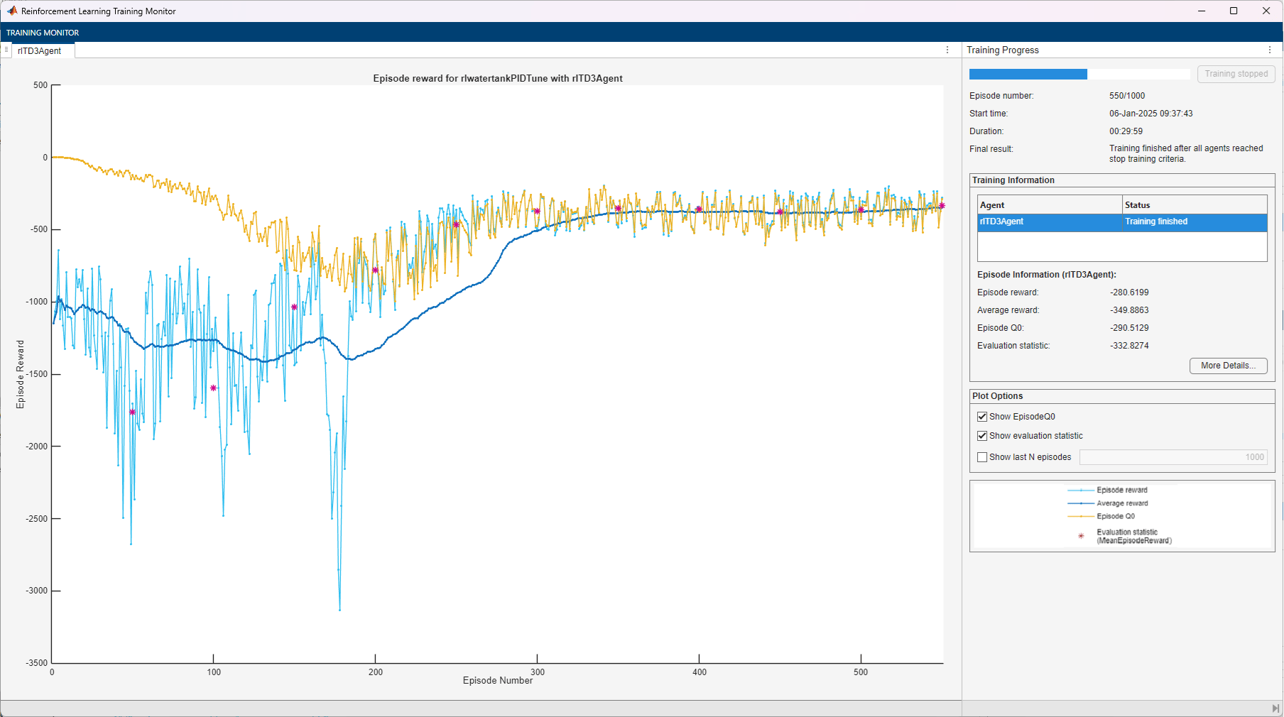 maxepisodes = 1000; maxsteps = ceil(Tf/Ts); trainOpts = rlTrainingOptions(... MaxEpisodes=maxepisodes, ... MaxStepsPerEpisode=maxsteps, ... ScoreAveragingWindowLength=100, ... Verbose=false, ... Plots="training-progress",... StopTrainingCriteria="EvaluationStatistic",... StopTrainingValue=-345); % agent evaluator evaluator = rlEvaluator( ... NumEpisodes=5,EvaluationFrequency=50,RandomSeeds=1:5);