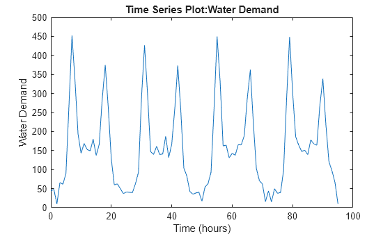 Figure contains an axes object. The axes object with title Time Series Plot:Water Demand, xlabel Time (hours), ylabel Water Demand contains an object of type line.