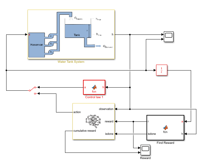 In addition to the reinforcement learning agent, a simple baseline controller is defined in the Control law MATLAB Function block. This controller activates a certain number of pumps depending on the water level.