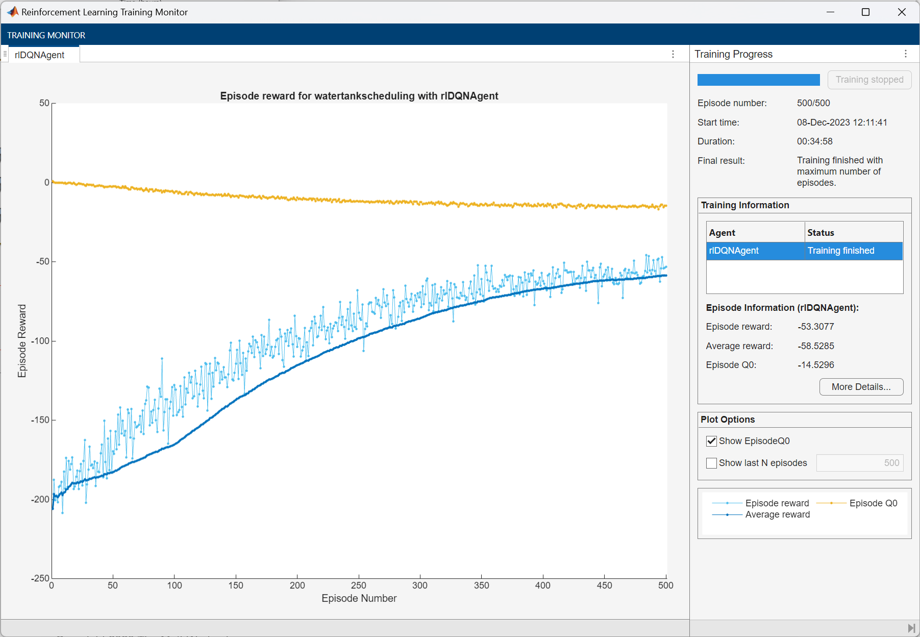 • Run training for 500 episodes, with each episode lasting at ceil(T_max/Ts) time steps.