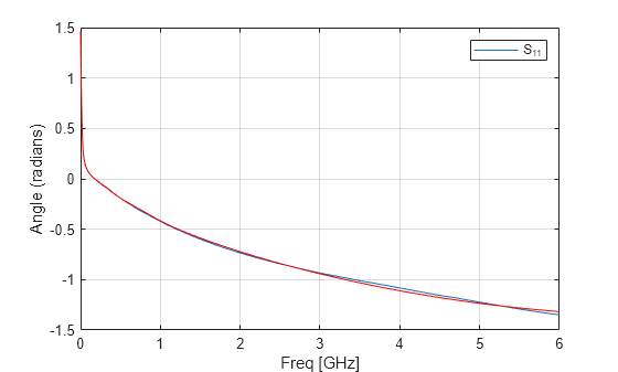 ![Figure contains an axes object. The axes object with xlabel Freq [GHz], ylabel Angle (radians) contains 2 objects of type line. This object represents S_{11}.](../../examples/rf/win64/RationalFunctionApproximationofSparameterDataExample_02.png)