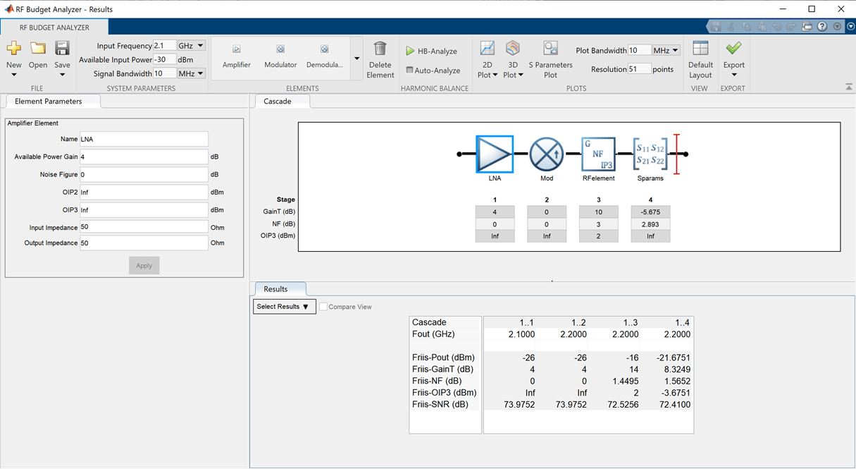 Compute RF budget results for chain of 2-port elements at an input frequency of 2.1 GHz, an available input power of -30 dBm, and a bandwidth of 10 MHz.