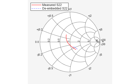 figure; smithplot(measured_data,2,2); hold on h = smithplot(de_embedded_sparams,2,2); h.LineStyle = {'-';':'}; h.ColorOrder = [1 0 0;0 0 1]; h.LegendLabels = {'Measured S22', 'De-embedded S22'};