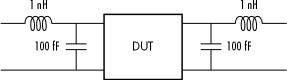 This example uses the S-parameter data in the file samplebjt2.s2p that was collected from a bipolar transistor in a fixture with a bond wire (series inductance of 1 nH) connected to a bond pad (shunt capacitance of 100 fF) on the input, and a bond pad (shunt capacitance of 100 fF) connected to a bond wire (series inductance of 1 nH) on the output, see Figure 1.