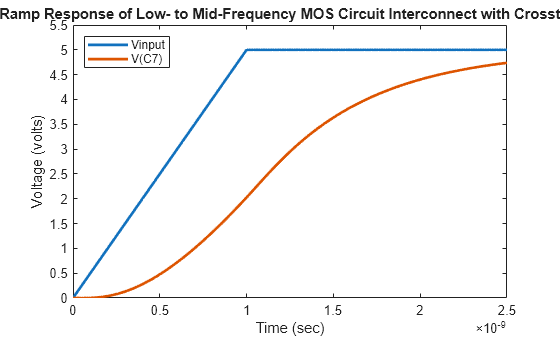 figure plot(t,input,t,outputC7,'LineWidth',2) axis([0 2.5e-9 0 5.5]); title("Ramp Response of Low- to Mid-Frequency MOS Circuit Interconnect with Crosstalk"); xlabel("Time (sec)"); ylabel("Voltage (volts)"); legend("Vinput","V(C7)",Location="NorthWest");
