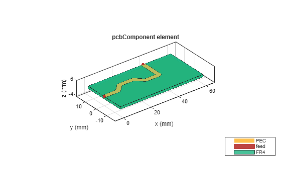Figure contains an axes object. The axes object with title pcbComponent element, xlabel x (mm), ylabel y (mm) contains 7 objects of type patch, surface. These objects represent PEC, feed, FR4.