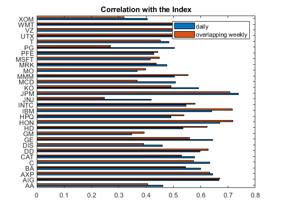 % Compare to non-overlapping weekly returns fridays = weekday(dates) == 6; index_weekly_close = index_adj_close(fridays); stocks_weekly_close = stocks_adj_close(fridays,:); index_weekly_returns = tick2ret(index_weekly_close); stocks_weekly_returns = tick2ret(stocks_weekly_close); [C,weekly_pval] = corr([index_weekly_returns stocks_weekly_returns]); w_weekly_nonoverlapping = C(2:end,1); maxweeklypvalue = max(weekly_pval(2:end,1)); % Compare the correlation with the daily and overlapping. barh([w_daily w_weekly_overlapping w_weekly_nonoverlapping]) yticks(1:30) yticklabels(t.Properties.VariableNames(3:end)) title('Correlation with the Index'); legend('daily','overlapping weekly','non-overlapping weekly');