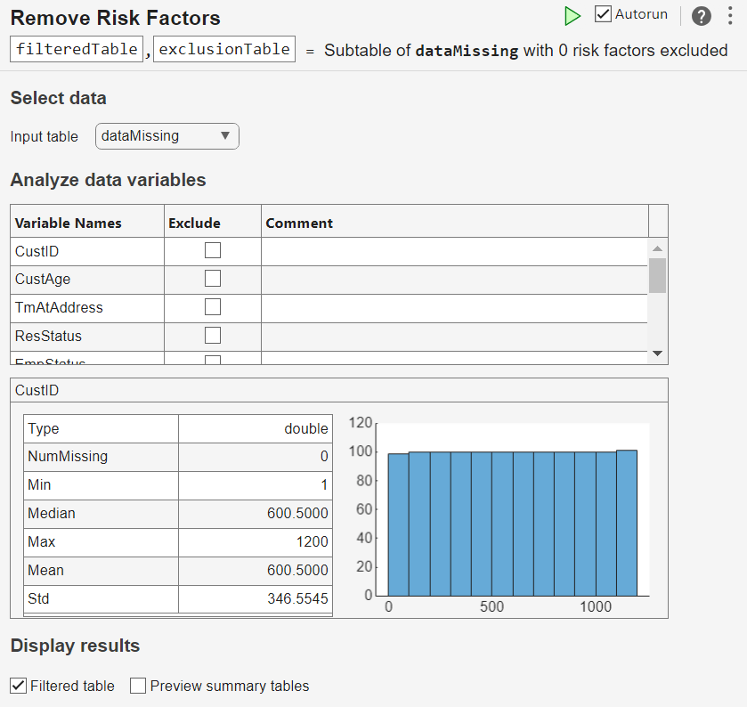 filteredTable— Subtable of the input table without the excluded risk factors. Use this subtable in the next step of the model development process, for example, feature selection.exclusionTable— Table that includes all the data of the input table together with the exclusion flags and comments in the task. To view this information, check the Preview summary tables box in the Display results section. The software stores this information in theexclusionTable.Properties.CustomPropertiesvariable.