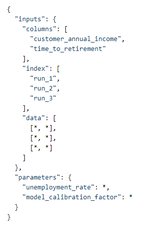 The inputs datum is compatible with the construction of Pandas DataFrames with split orientation. For more information, see the example implementation in the Flask Interface section.