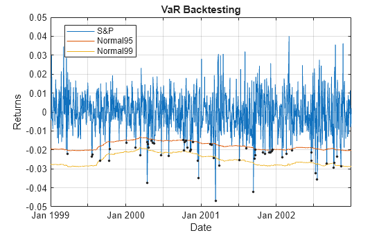 vbt = varbacktest(EquityIndex,[Normal95 Normal99],... 'PortfolioID','S&P', ... 'VaRID',{'Normal95' 'Normal99'}, ... 'VaRLevel',[0.95 0.99],'Time', Date); disp(vbt)