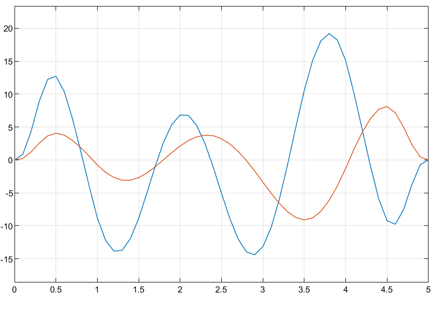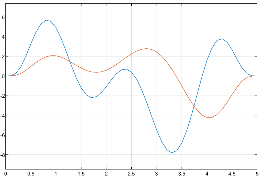 The model contains a Constant block, Waypoints, that specifies six two-dimensional waypoints to the Waypoints port of the Minimum Jerk Polynomial Trajectory block, and another Constant block specifies time points for each of those waypoints to the TimePoints port. The input to the Time port is a ramp signal, to simulate time progressing.
