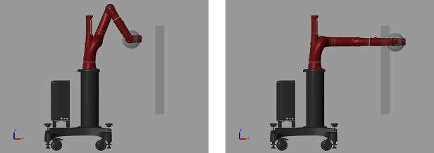 The following figures show the robot visualization of the initial configuration and the target configuration related to the location of the planar object. The planar object is placed so that the robot will collide to it during trajectory tracking.