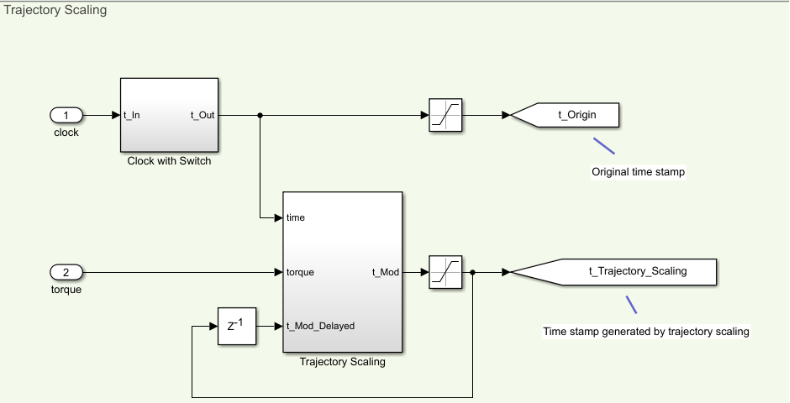 In the Trajectory Scaling block, it is required to estimate the external torque to calculate , where is the measured torque from the Simscape model, and is the expected torque of the desired motion on the previous time stamp. In the External Torque Observer section of the model, the Inverse Dynamics block calculates the expected torque which is subtracted from the measure torque. Expected torque is: .