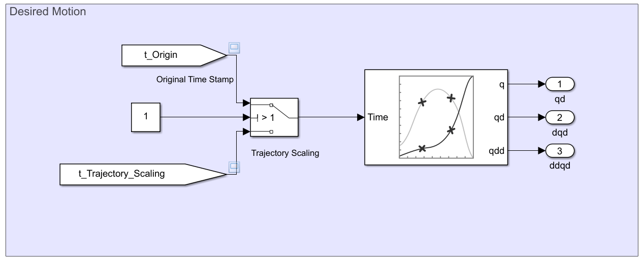 In the Desired Motion area, the output of the trajectory scaling algorithm is fed as an input to a Polynomial Trajectory block. This block compute a quintic polynomial trajectory given the known values of q0 and q1 and their boundary conditions of zero velocity and acceleration. It outputs the position, velocity, and acceleration: , , and , which are fed to the Computed Torque Controller subsystem.