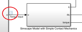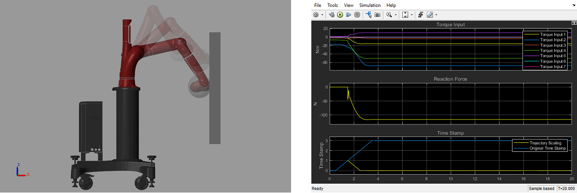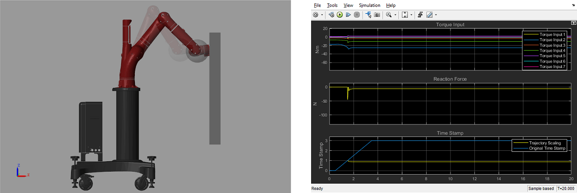The Simscape Multibody robot model is imported from the same .urdf file using smimport, where a set of torque actuators and sensors for joint torque, joint position and velocity are added. A contact mechanism block simulates the reaction force between the end effector and the obstacle as a sphere and a plane, where a simple linear spring-damper model is used.