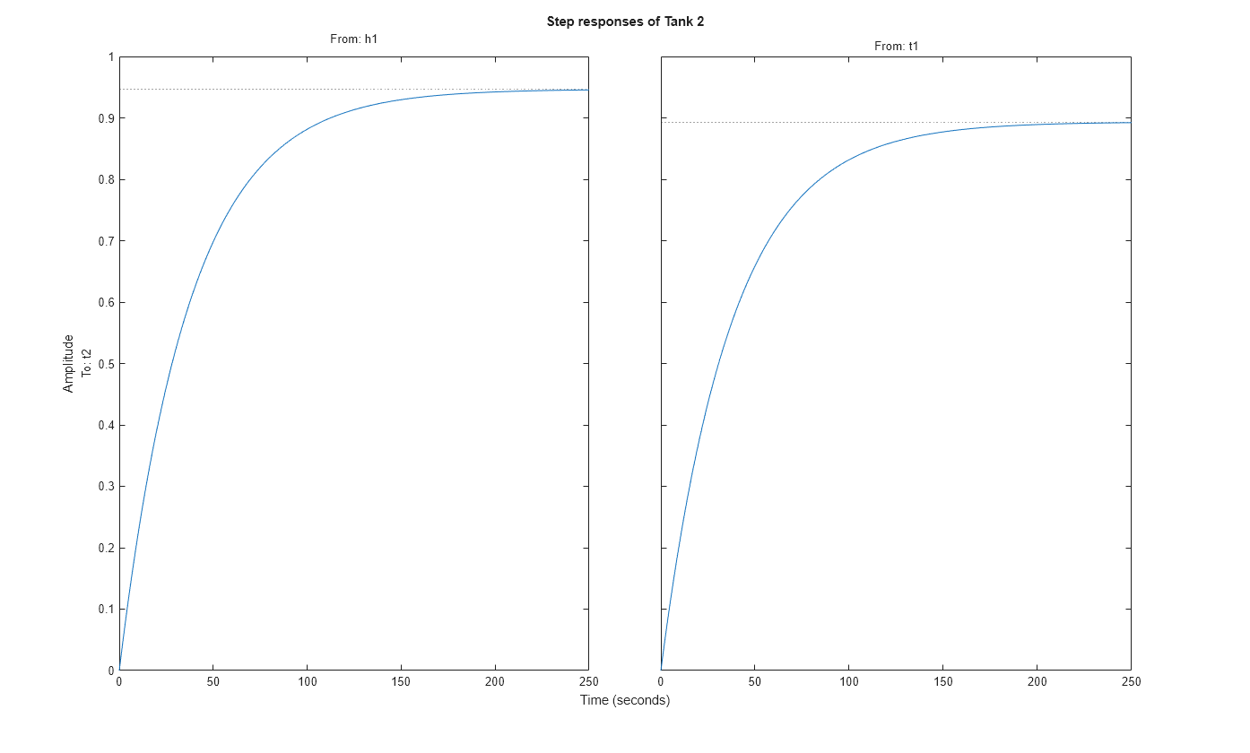 A = -(h1ss + beta + alpha*fb)/(A2*h2*alpha); B = [ (t2ss+t1ss)/(alpha*A2*h2), (h1ss + beta)/(alpha*A2*h2) ]; C = 1; D = zeros(1,2); tank2nom = ss(A,B,C,D,'InputName',{'h1','t1'},'OutputName','t2'); step(tank2nom), title('Step responses of Tank 2')