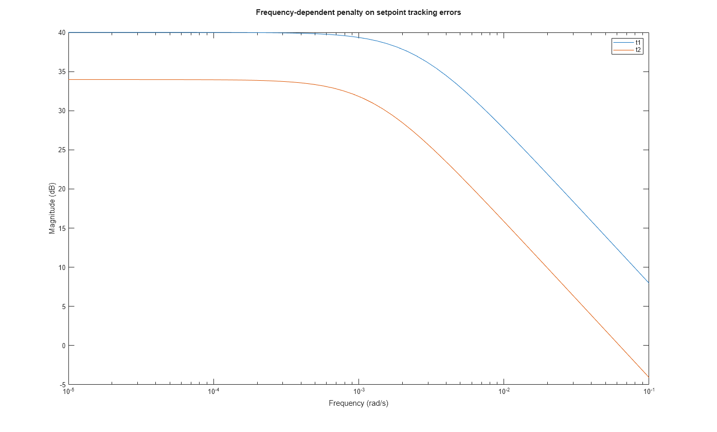 Wt1perf = tf(100,[400,1]); % t1 tracking error weight Wt2perf = tf(50,[800,1]); % t2 tracking error weight clf bodemag(Wt1perf,Wt2perf) title('Frequency-dependent penalty on setpoint tracking errors') legend('t1','t2')