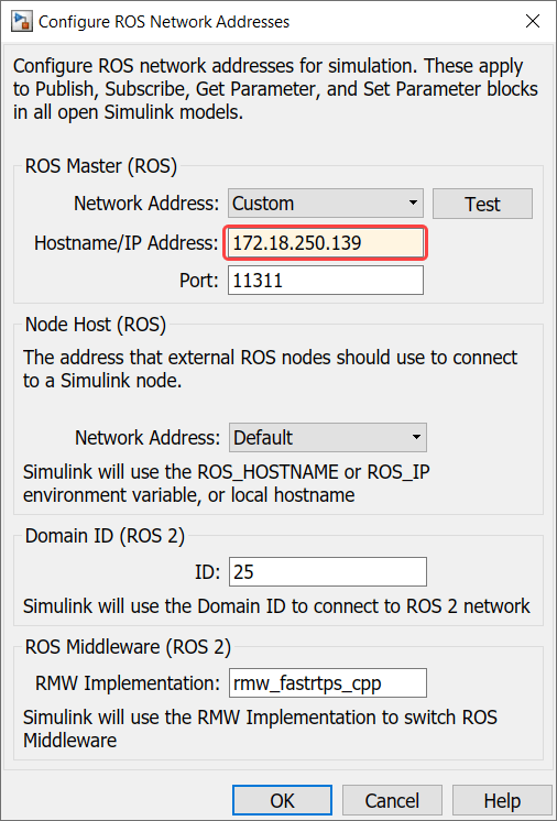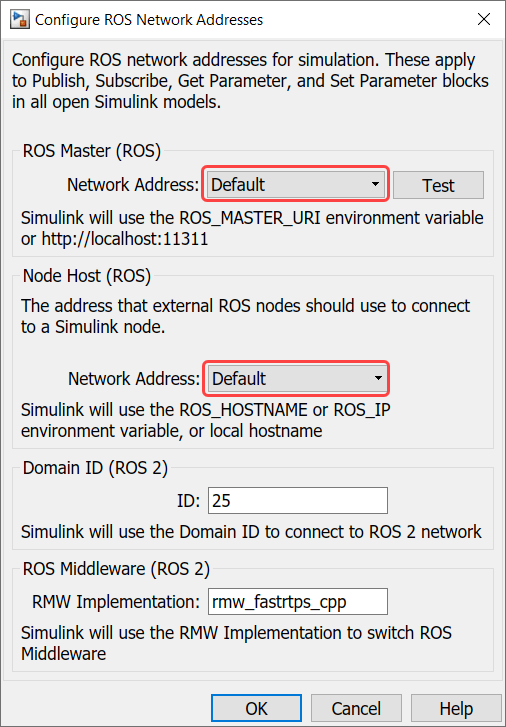Specify ROS network settings in Simulink: By default, Simulink uses the ROS connection settings from rosinit in MATLAB. To override these settings, specify ROS connection settings in Simulink. Under the Simulation tab, in Prepare section, select ROS Network and set the ROS Master and Node Host network addresses: