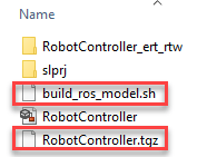 Generated C++ code archive: No matter what Build action you select (None, Build and load, Build and run), Simulink always generates two files in your current folder: an archive containing the C++ source code (RobotController.tgz in our example) and a shell script for extracting and building the C++ code manually (build_ros_model.sh). If your MATLAB computer is not connected to the ROS device, you can transfer the files manually and build them there. Ensure that build_ros_model.sh is set up as an executable on your ROS device by entering the following command:
