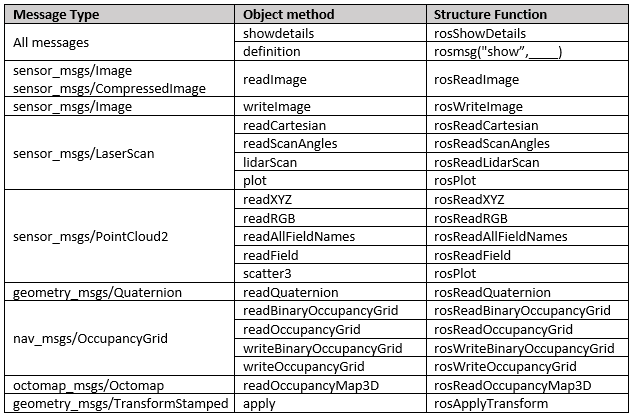 Because functions on the ROS message objects are not usable with message structures, new functions have been introduced for handling messages. This list includes functions for reading data from or writing data to specialized messages.