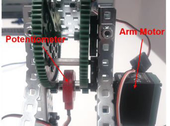 3. Connect the DC motor on the robotic arm to motor pin 5 on the VEX microcontroller. Insert the shaft of the VEX potentiometer through the motor shaft as shown in the figure below. Since the potentiometer has a limited rotation range of about 260 degrees, ensure that the potentiometer is not at its extreme position when inserting it through the motor shaft so that the robotic arm is not restricted from rotating due to the potentiometer's placement. Connect the potentiometer to analog port 4 on the VEX microcontroller.