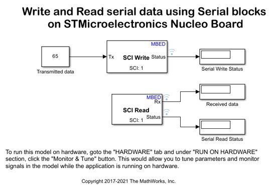 1. Open the Read and write the serial data using SCI(serial) blocks on STMicroelectronics Nucleo board model.
