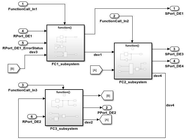functions. Signal lines that connect the Function-Call Subsystem blocks,