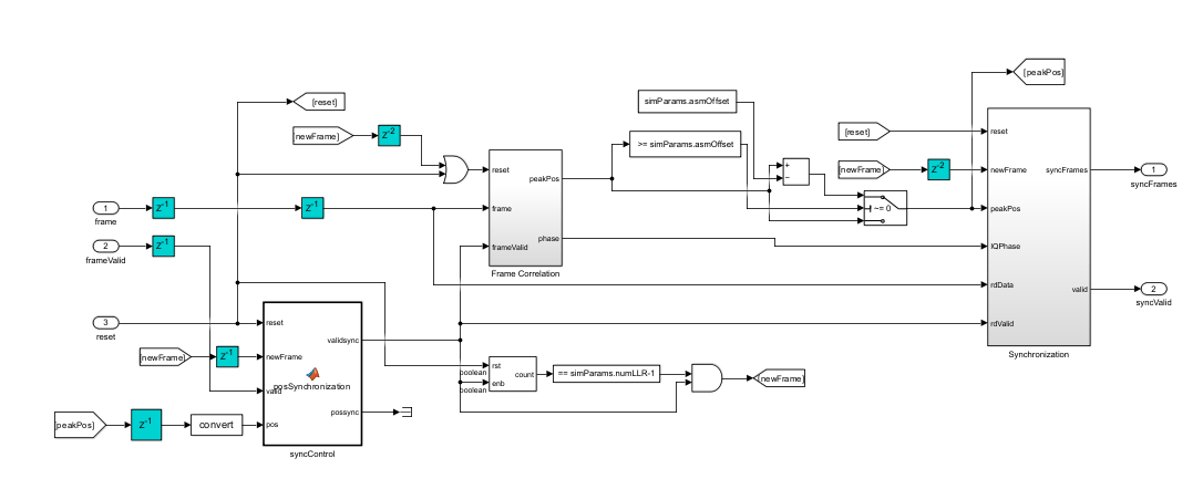 The ASM Synchronizer subsystem performs the frame synchronization and resolves phase ambiguity. Within this subsystem, the Frame Correlation subsystem correlates the demodulated symbols with sequences corresponding to the original ASM, introducing phase ambiguity. The Frame Correlation subsystem provides the highest correlation peak and phase ambiguity. The Synchronization subsystem use this correlation to achieve frame synchronization and subsequently resolves the phase ambiguity across the complete set of demodulated symbols. For more details on the correlation process, see section 9.3.7 in [ 3 ]. The ASM Synchronizer subsystem uses the Variant Subsystem to select either a BPSK ASM Synchronizer or QPSK ASM Synchronizer based on the specified modulation scheme.