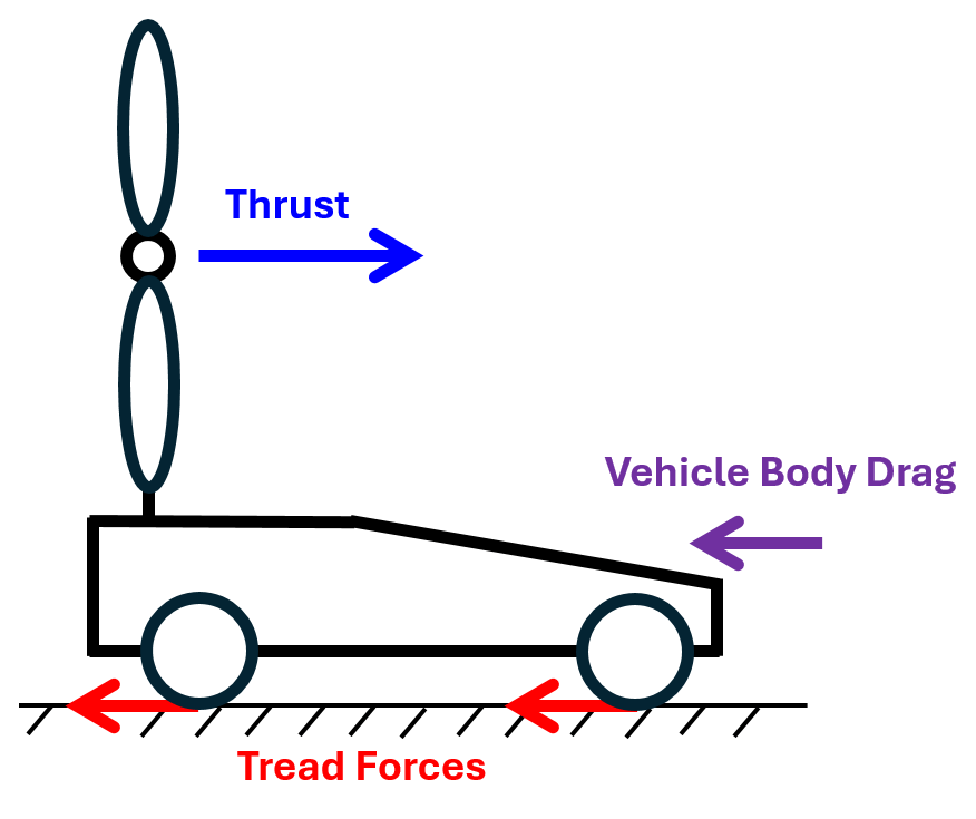 This example shows a wind-powered four-wheel vehicle with a propeller that travels faster than the wind speed. The wind blows from the rear to the front of the vehicle, and the propeller thrust is the driving force. The forces acting on the vehicle are the propeller thrust, the vehicle body drag, and the tread forces. When the vehicle speed exceeds the wind speed, the body experiences a drag force. The vehicle travels faster than the wind speed because the thrust force overcomes the drag and tread forces. The figure shows the directions of the forces exerted on the vehicle.