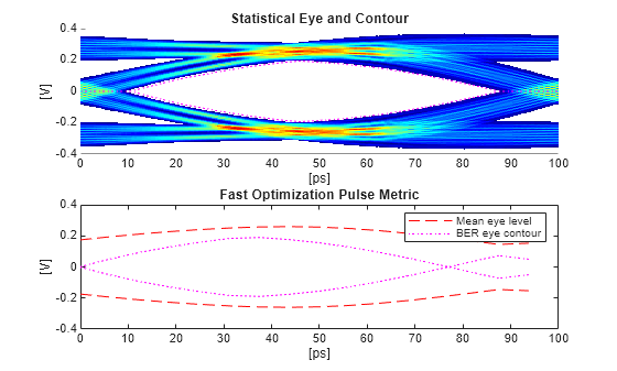 ![Figure contains 2 axes objects. Axes object 1 with title Statistical Eye and Contour, xlabel [ps], ylabel [V] contains 3 objects of type image, line. Axes object 2 with title Fast Optimization Pulse Metric, xlabel [ps], ylabel [V] contains 2 objects of type line. These objects represent Mean eye level, BER eye contour.](../../examples/serdes/win64/CompareOptPulseMetricResultsToStatisticalEyeAnalysisExample_01.png)