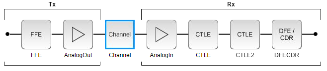 Note that the CTLE block portion of the Receiver model differs from Part 1 above, in that there are 2 stages represented by 2 blocks, and there is the addition of a DFECDR block as well.