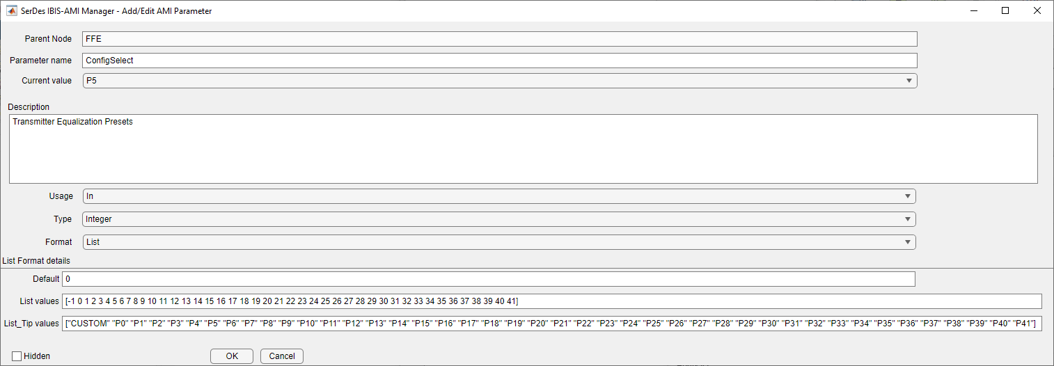 You can see that a new constant block has been added called FFEParameter.ConfigSelect. This is created automatically by the IBIS-AMI Manager when a new Reserved Parameter is added. Next, you can follow these steps to re-configure the selection of tap weight presets for time domain (GetWave) simulation: