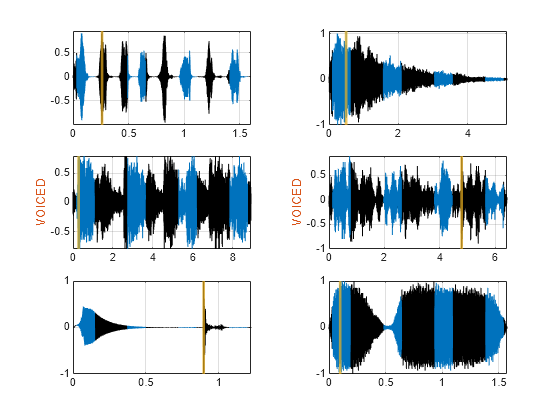 tiledlayout flow while hasdata(sd) [sg,nf] = read(sd); lbls = read(ld); nexttile msk = signalMask(lbls{:}.RanROI{:},SampleRate=nf.SampleRate); plotsigroi(msk,sg) colorbar off xlabel('') xline(lbls{:}.Maximum{:}.Location, ... LineWidth=2,Color="#EDB120") if lbls{:}.Voice{:} ylabel("VOICED",Color="#D95319") end end
