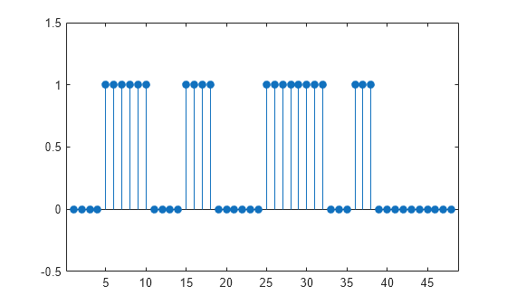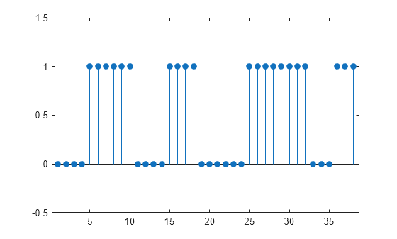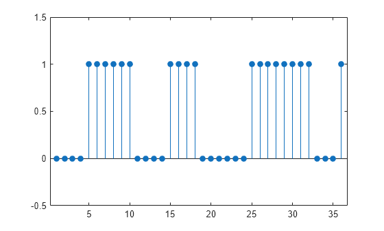 Consider a two-column matrix of beginning and end samples of four possible regions of interest of a signal. Convert the ROI limits to a logical sequence and display the sequence.