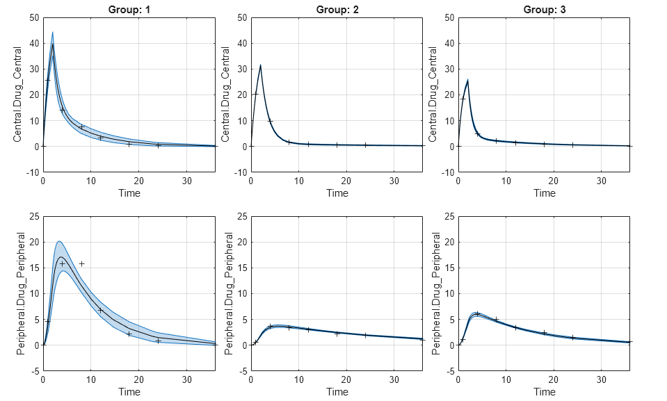 The function plots the observation data points as black plus signs and the model predictions as solid lines.