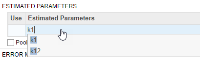 In the Fit step, define the model parameters to estimate in the Estimated Parameters table. Double-click the empty cell in the Estimated Parameters column and type k1. The app shows model components with matching names. Select k1 from the list.