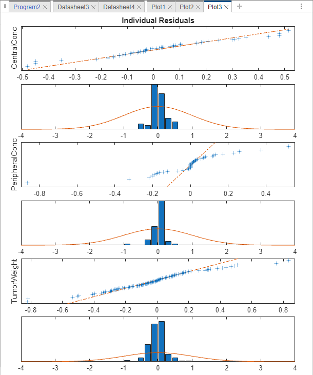 The plot shows whether the residuals for each response are normally distributed. In an ideal normal probability plot of residuals, the residuals line up along the diagonal line across the plot and the histograms indicate a normal fit. However, from the plot, the residuals for all three responses, especially CentralConc and PeripheralConc, do not seem to be normally distributed. It could be an indication that the constant error model assumption is incorrect.