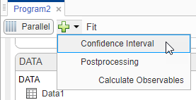 Click the Program2 tab. Click the green (+) icon at the upper left and select Confidence Interval. A Confidence Interval step appears following the Fit step.