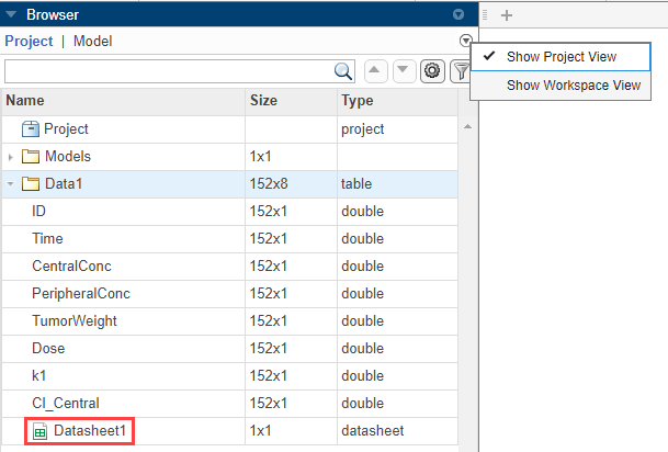 In the Browser pane (if it is in the default Project View), expand the Data1 folder and double-click Datasheet1 to open the data set.