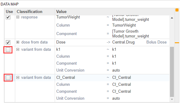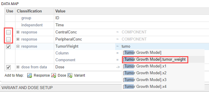 In the Data Map table, clear CentralConc and PeripheralConc. Keep TumorWeight selected.