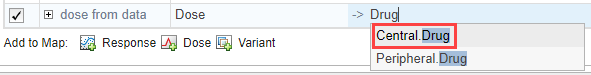 Apply the doses from the data set. In the dose from data row, map the Dose column to Central.Drug to indicate that the Drug species in the Central compartment is being dosed.