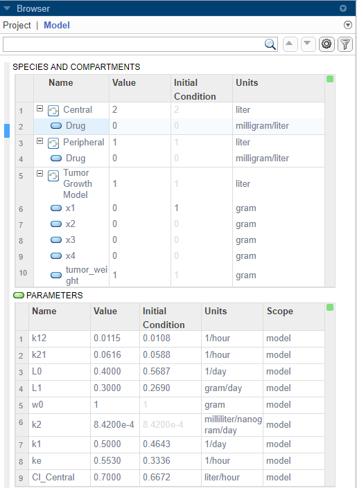 You can view the initial conditions of model quantities, namely compartments, species, and parameters, before simulating a model. The initial conditions are the quantity values at simulation time = 0 after applying the assignment rules, variants, and doses (if any at time = 0). For details, see Model Simulation. You can use this information to debug a model and check if the quantity values are initialized as you expect before simulating the model.