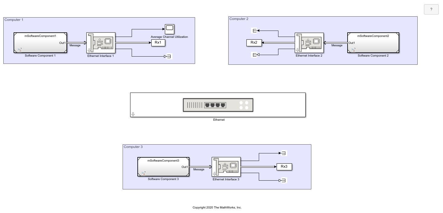 Model an Ethernet communication network with CSMA/CD protocol using Simulink® messages and SimEvents®. In the example, there are three computers that communicate through an Ethernet communication network. Each computer has a software component that generates data and an Ethernet interface for communication. Each computer attempts to send the data to another computer with a unique MAC address. An Ethernet interface controls the interaction between a computer and the network by using a CSMA/CD communication protocol. The protocol is used to respond to collisions that occur when multiple computers send data simultaneously. The Ethernet component represents the network and the connection between the computers.