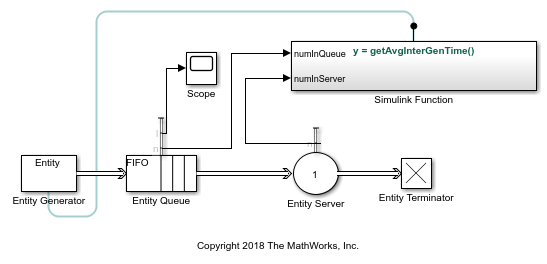 This example shows a queuing system in which feedback influences the arrival rate. The goal of the feedback loop is to stabilize the entity queue by slowing the entity generation rate of the Entity Generator block as more entities accumulate in the Entity Queue block and the Entity Server block.