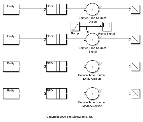 Dialog— You can define a constant service time value. In the first modeling pattern, entities are delayed for2seconds. The block then attempts to forward entities to the next block.Signal port— An incoming Simulink® signal determines the service time. In the second modeling pattern, the block uses ramp signal values as the service time source.Attribute— A specified entity attribute value determines the service time. In the third modeling pattern, each entity carriesAttribute1with value4which is the service time source.