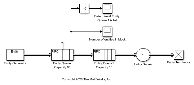 This example shows how to model basic queueing systems in a discrete-event simulation using the Entity Queue and Entity Server blocks.